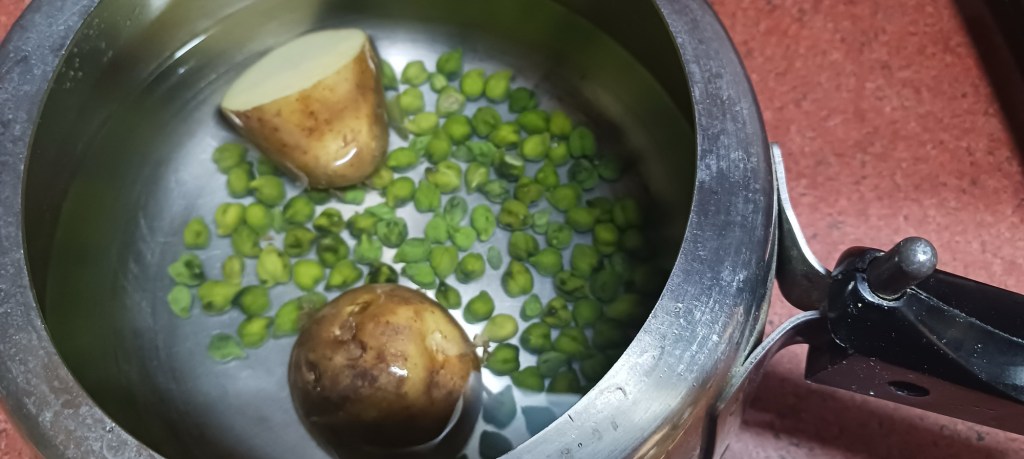 Step 3. Boil potato and green chickpeas in a pressure cooker with any other way you may like to boil.