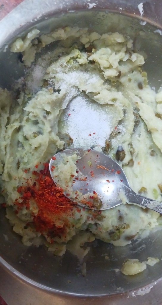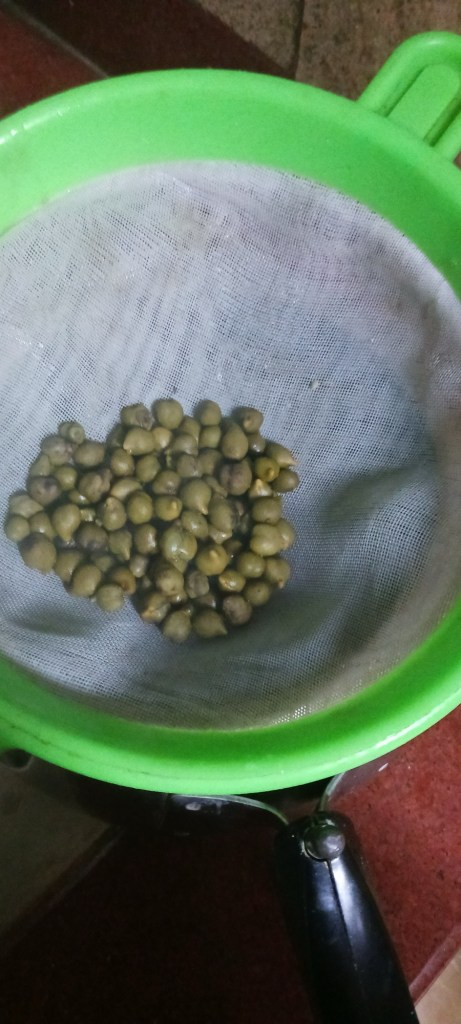 Step 4. Once boiled take potato out, peel potato. Seive green chickpeas.