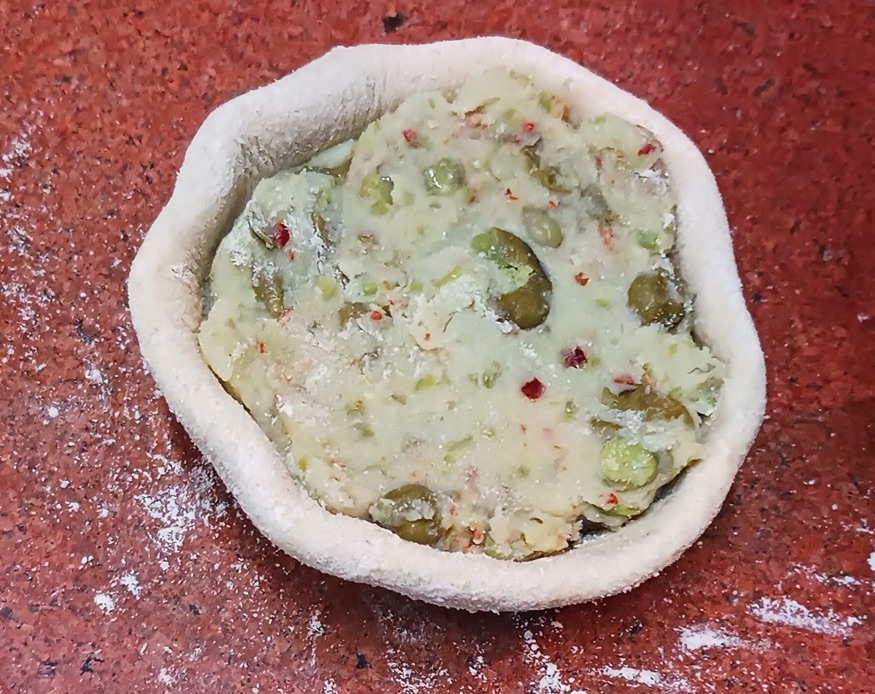 Take handful of potato green chickpeas mixture and stuff it in dough.