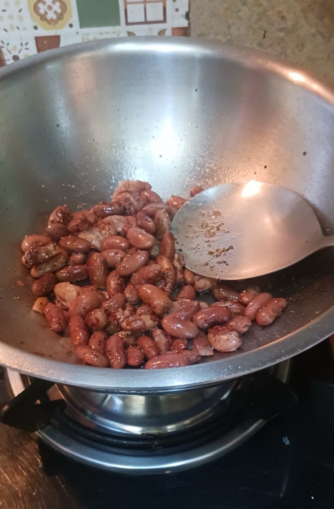 Step 4. Add half of the red beans in the frying pan, add salt and red chilli to taste, mix well.