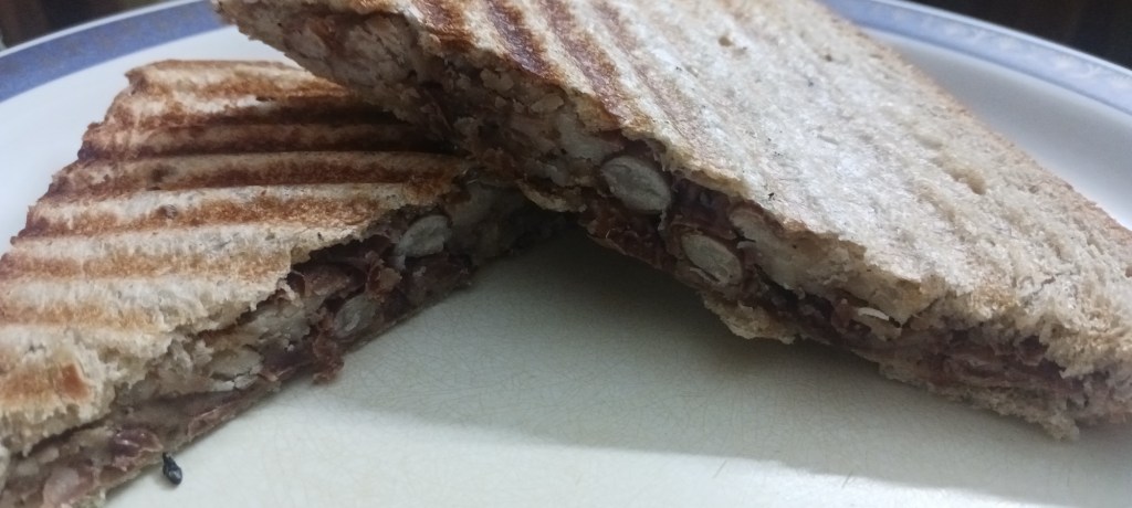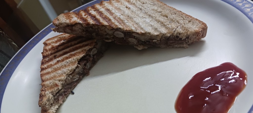 Ingredients: One bowl of boiled red beans, 1 tablespoon of cooking oil, black pepper, salt, red chilli., bread, Maggie Tomato Sauce.