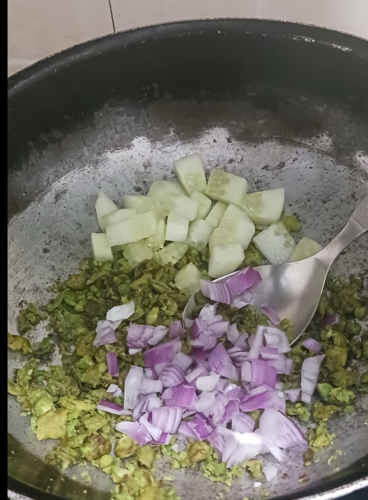 Ingredients: 2 breads, half bowl of fresh green Chickpeas, half onion, half cucumber, mayonnaise.