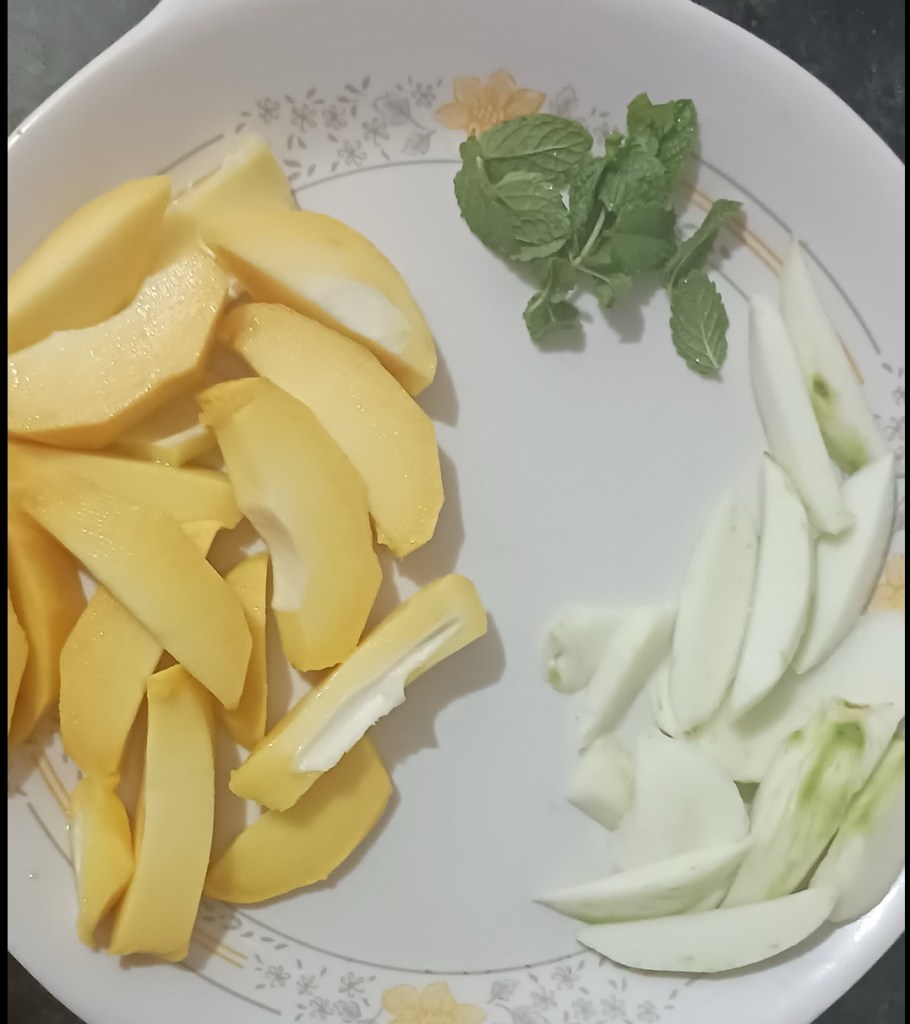 Ingredients: 1 ripe mango, 1 unripe mango, 9-10 mint leaves, 2-4 spoon of sugar, water. That’s it.