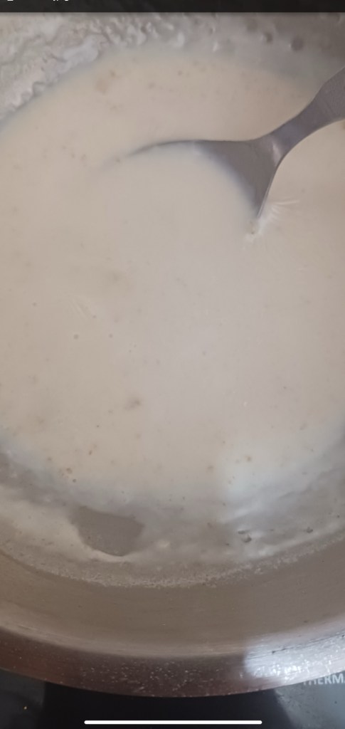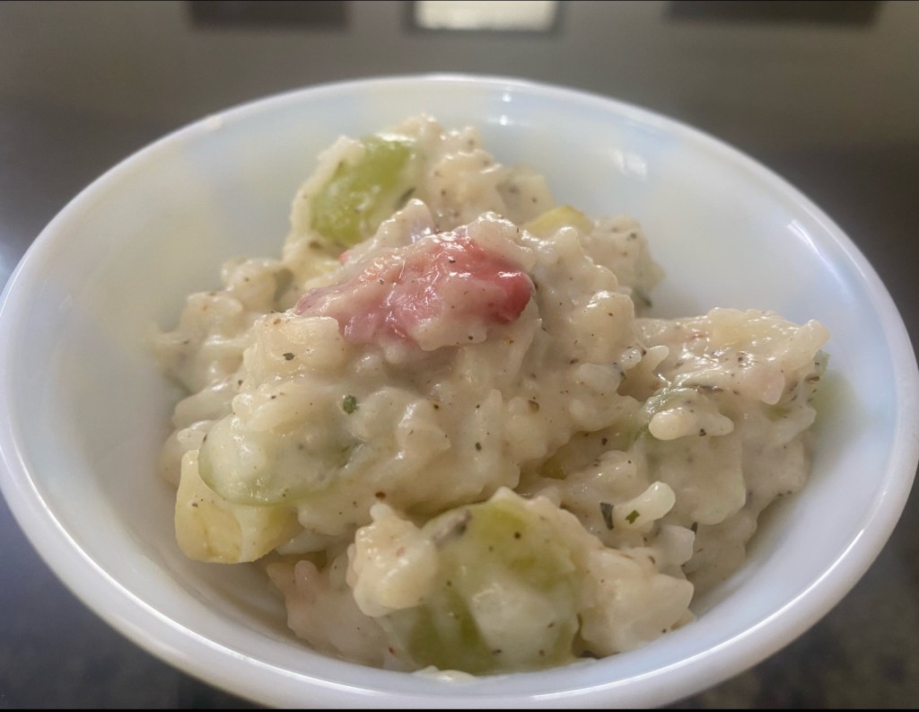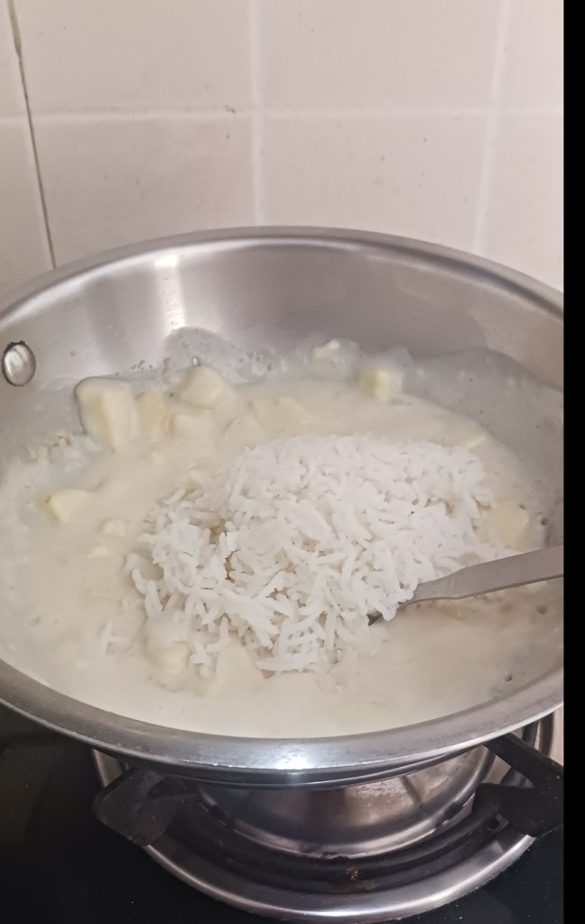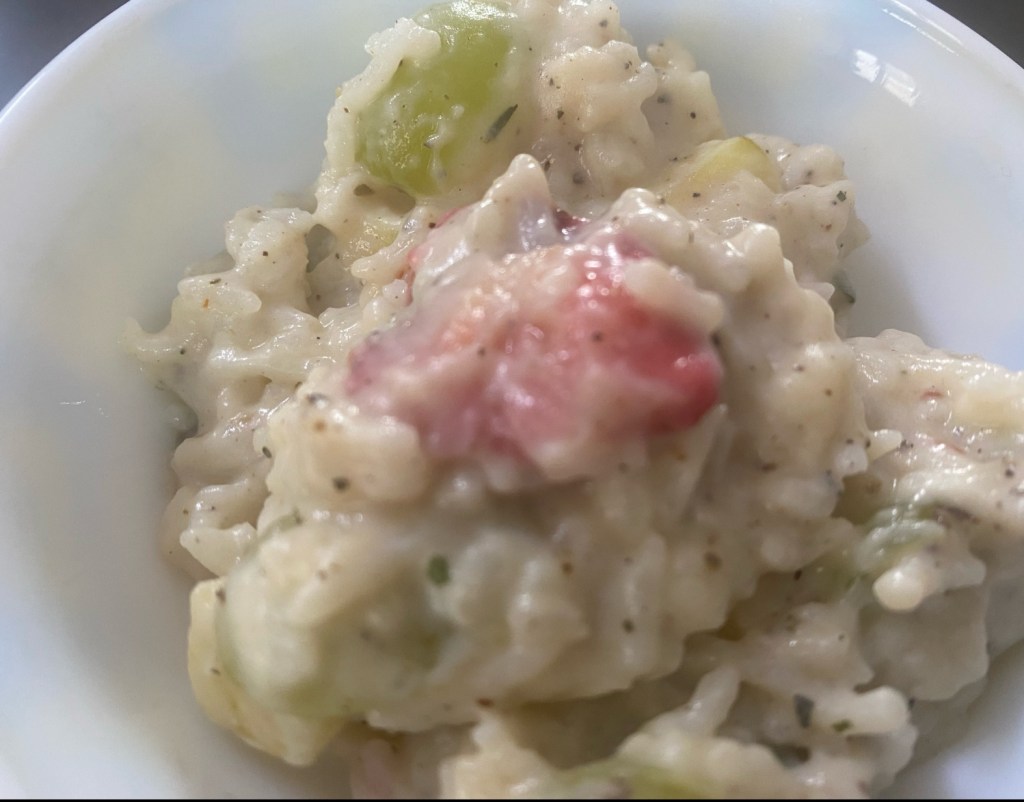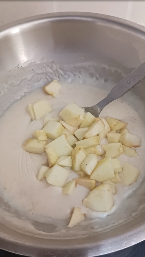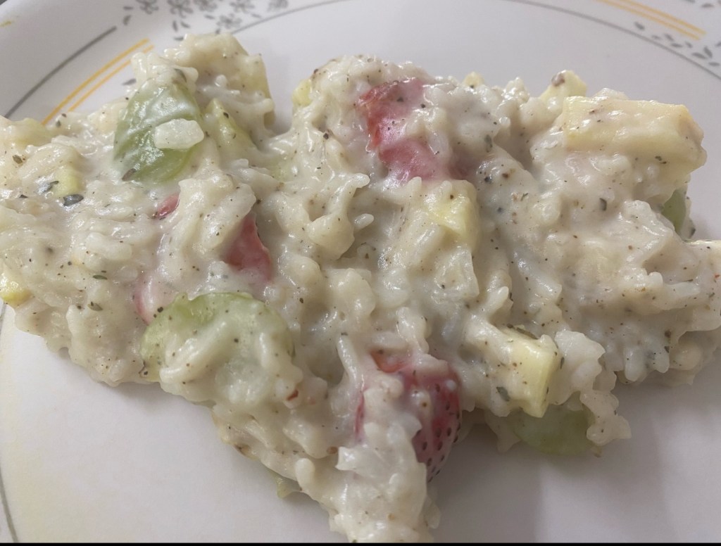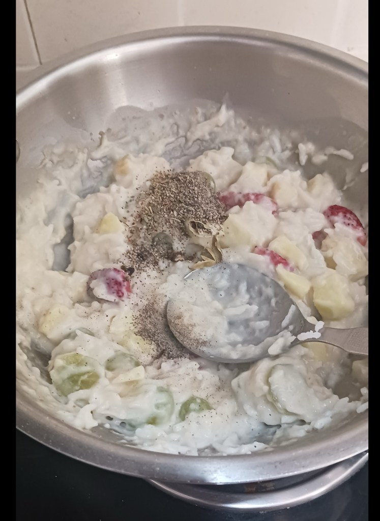 Ingredients: 1 bowl of boiled rice, one cube of salted butter, one mug of milk, 2 tablespoons of refined flour, one small apple, 10-12 grapes, 3 strawberries, sugar or sugar powder, cardamom, black pepper, Italian seasoning. That’s all.