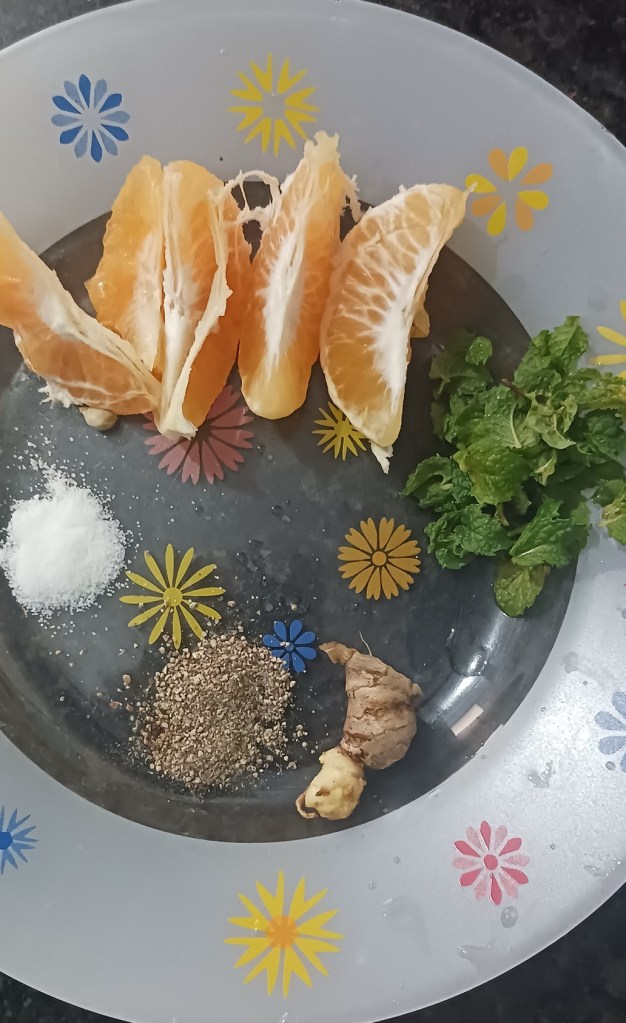 Step 4. Take two branches of fresh mint. One inch by half centimeter of ginger. Take half tsp of black pepper and one tsp of salt. Take seeds out from orange flakes.