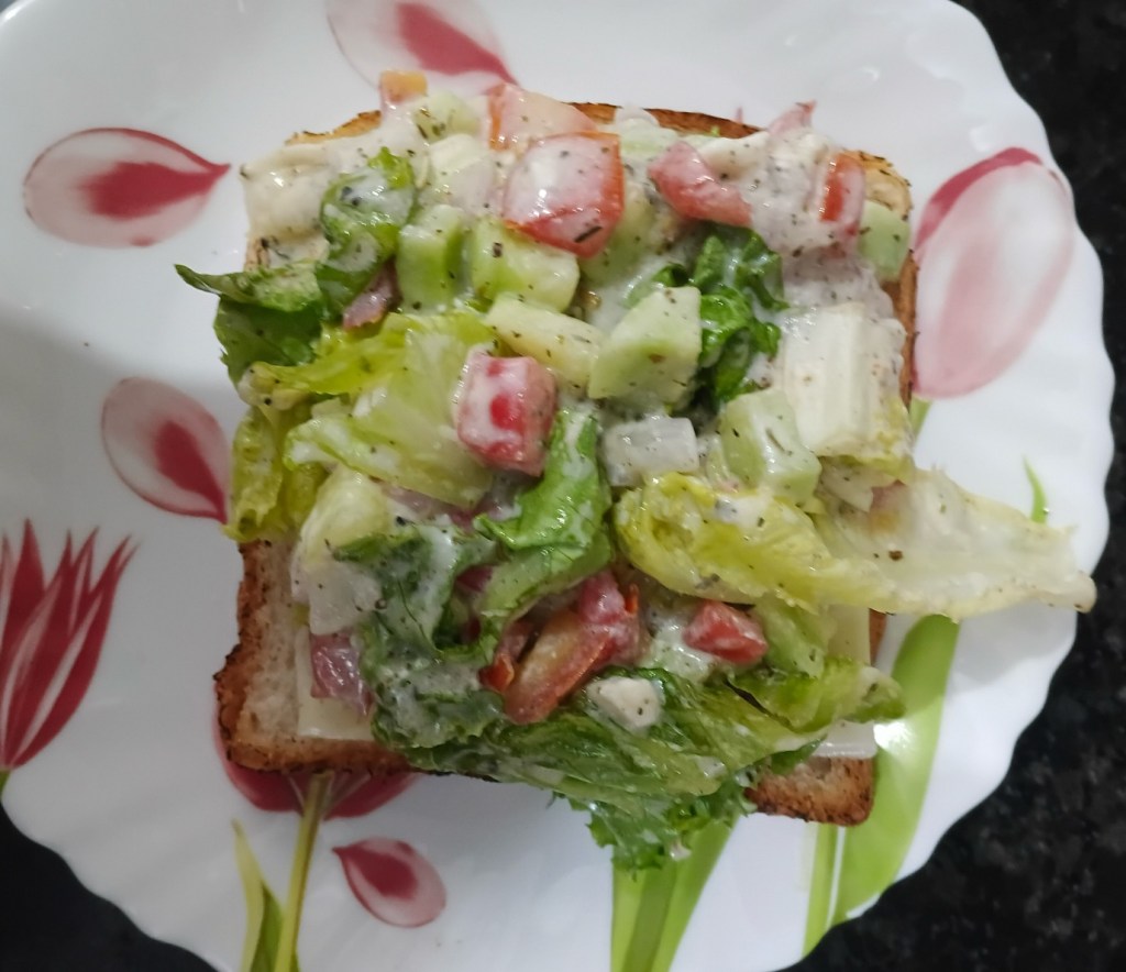 Ingredients: lettuce, cucumber, tomato, onion, cottage cheese, bread, Italian seasoning, cheese spread, breads, salt, red chilli.