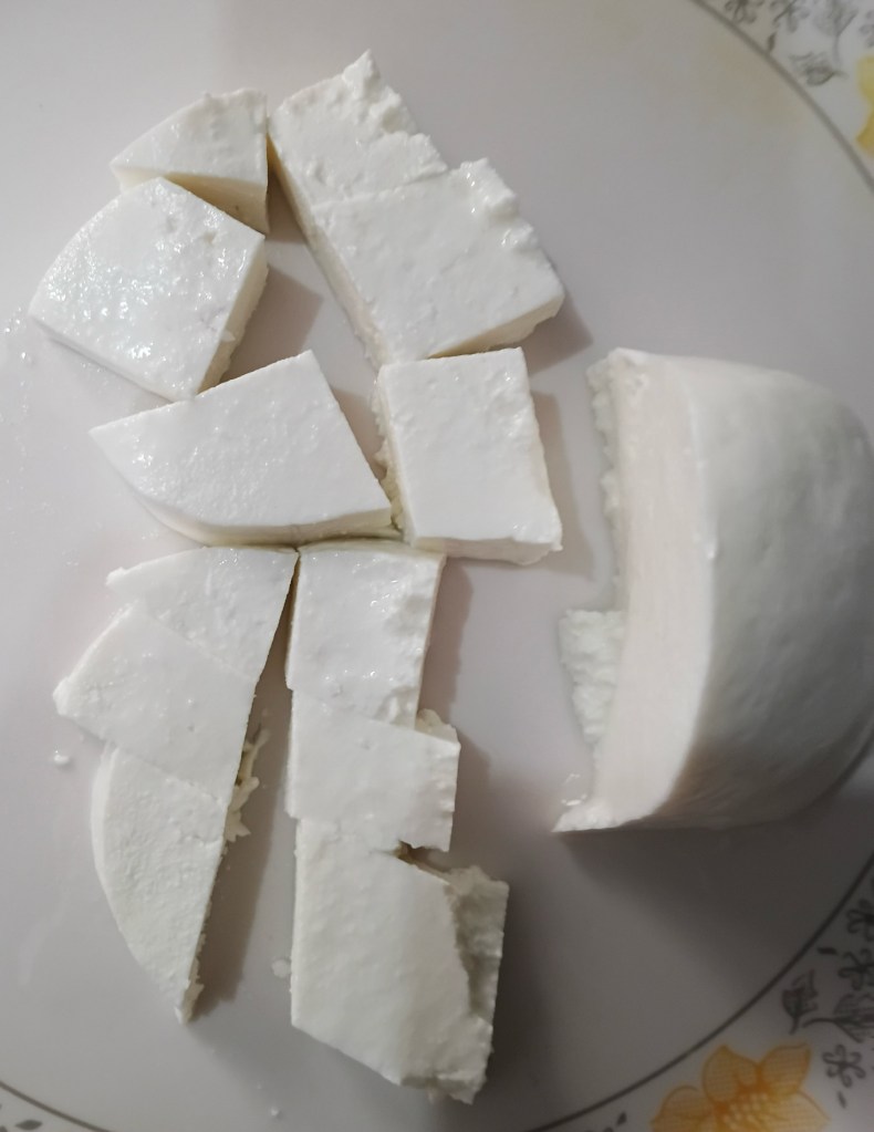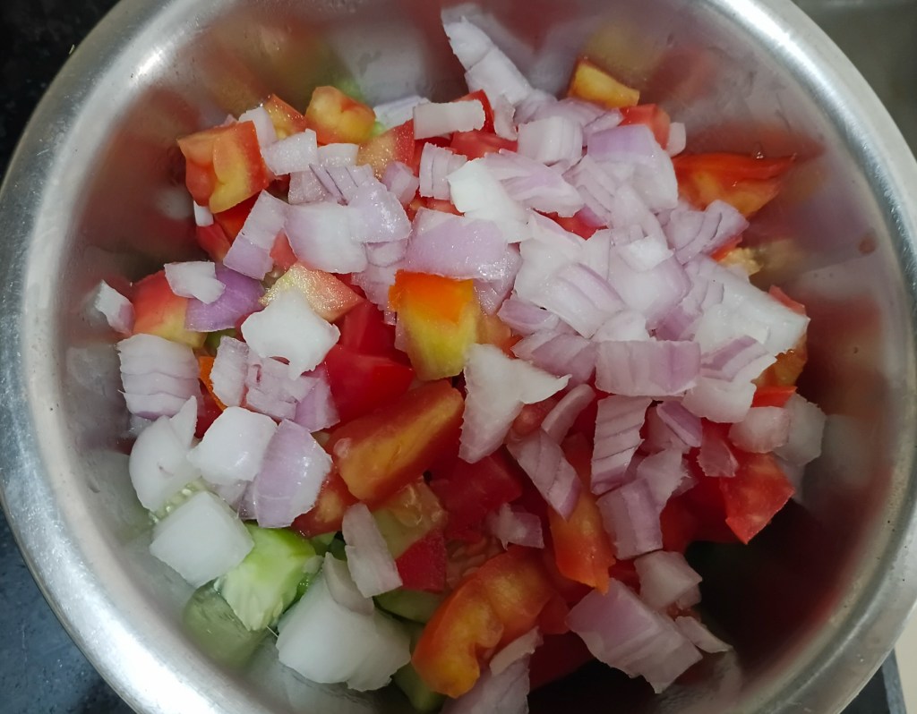 Step 2. Cut one onion, one tomato and one cucumber in small parts.