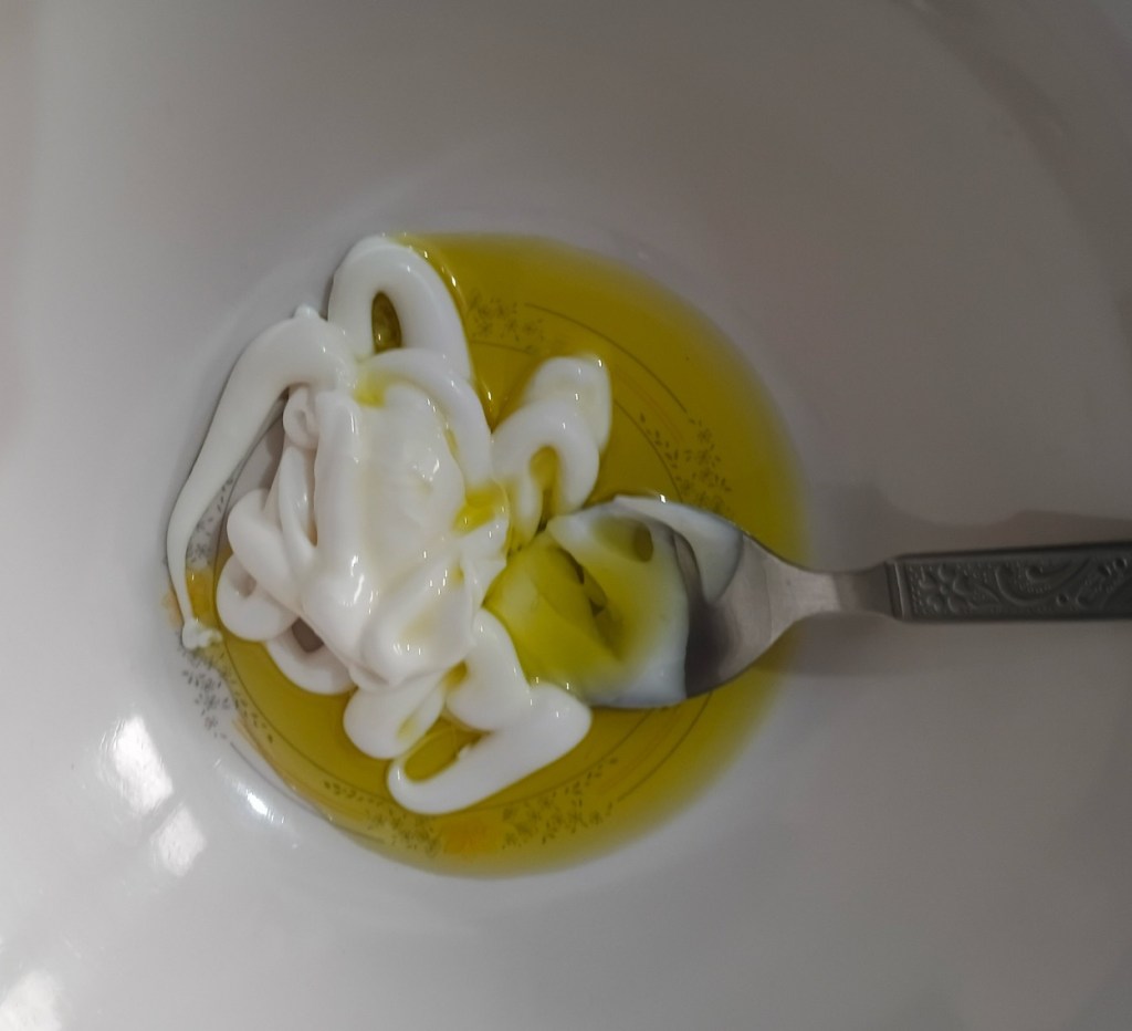 Step 3. Take 4 spoons of Mayonnaise and 4 spoon of virgin olive oil in a big serving bowl.