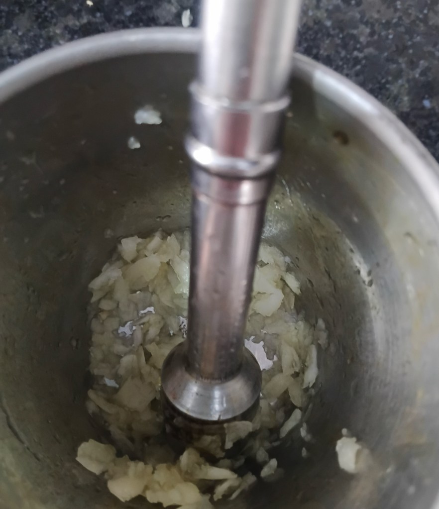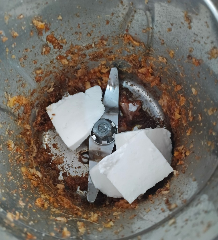 Step 9. The garlic is coarse. So we need a mixture grinder to make it smooth mixture which can be used to marinate cottage cheese. Add these contents of frying pan to mixture grinder, add 2 blocks of cottage cheese as well.