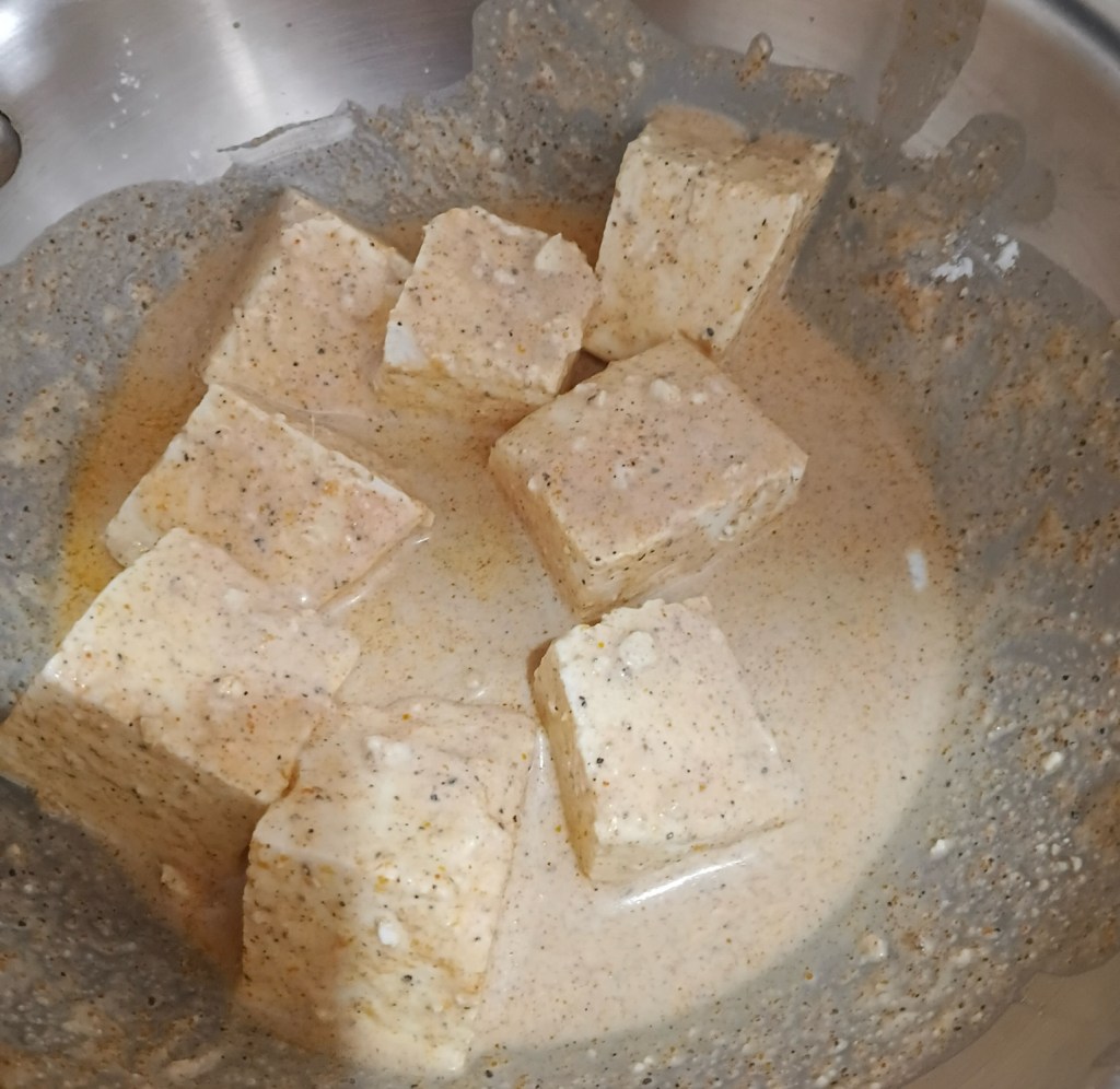 Step 13. Add cottage cheese blocks to it now. Keep it for marination for several hours. I kept it for 4 hours.