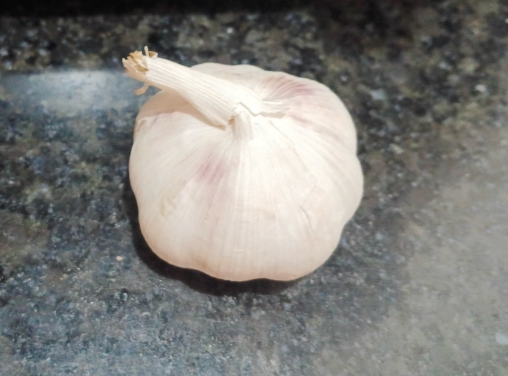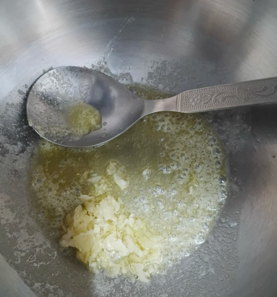 Step 6. Add minced garlic in hot frying pan with heated butter. Heat till golden color comes in garlic in pan.