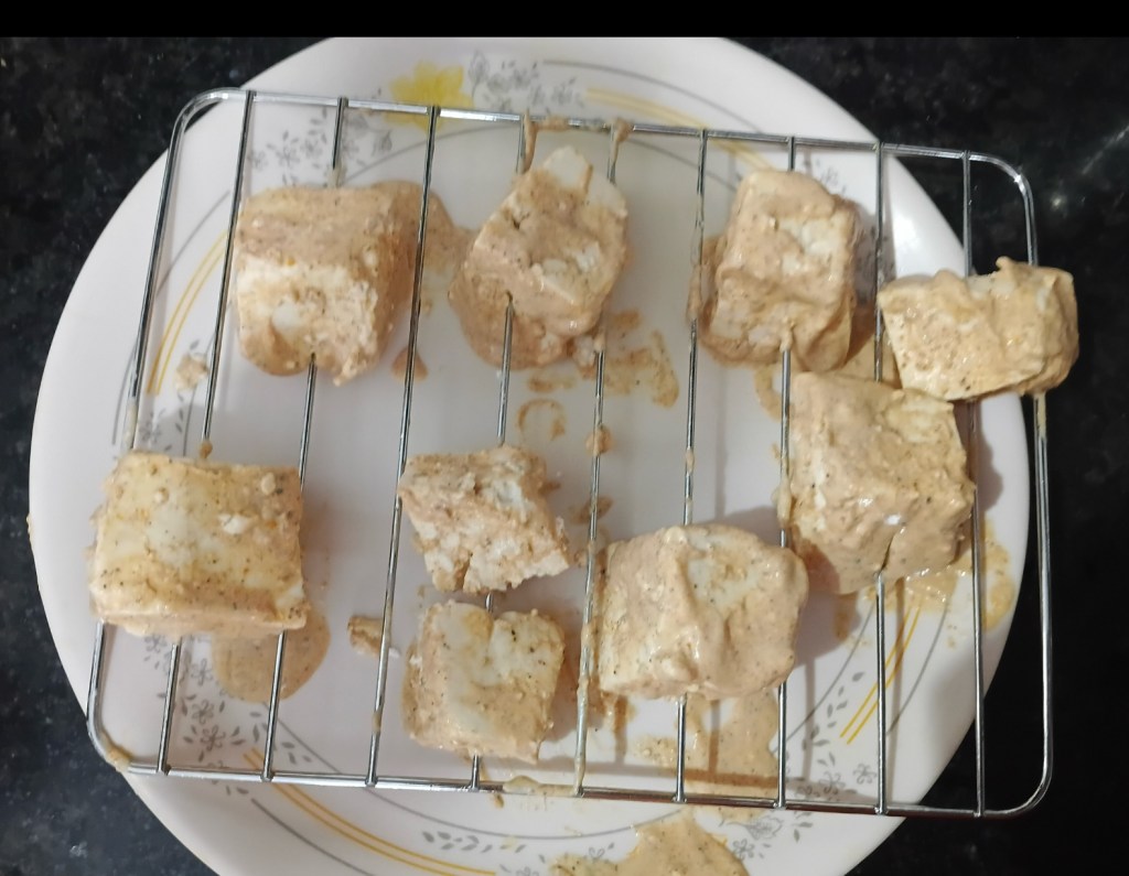 Step 2. Arrange marinated cottage cheese on grilled. You can use barbecue sticks for it as well.