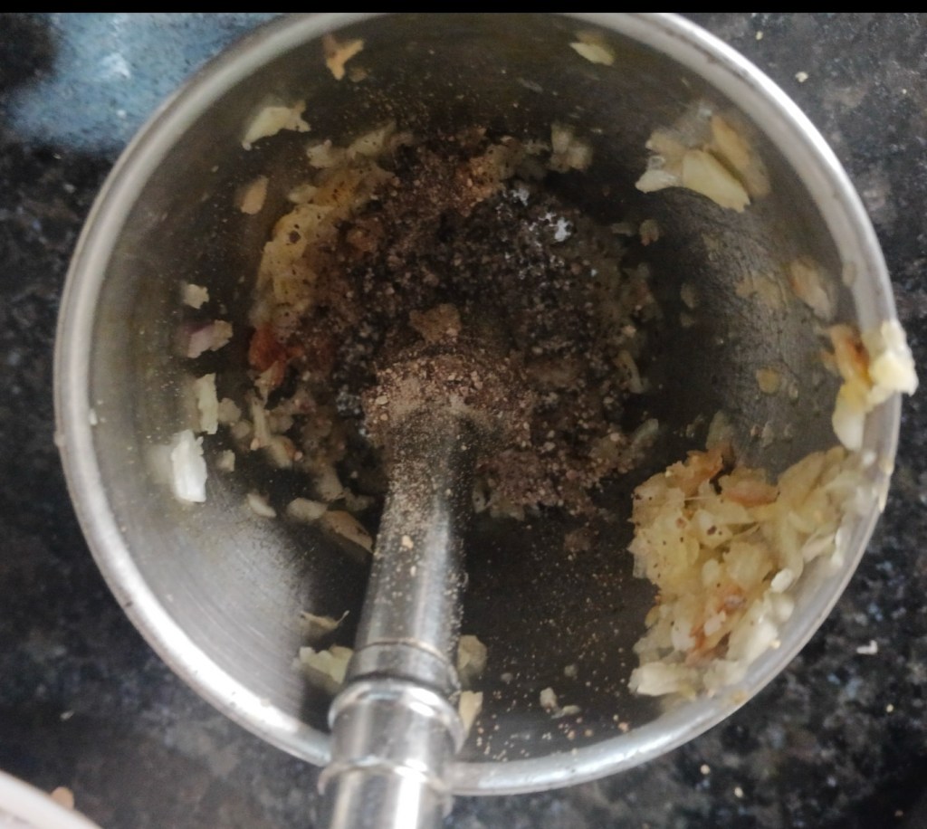 Step 3. Use a pestle to mince the ginger garlic well. Add half spoon of black pepper powder with pestle as well.