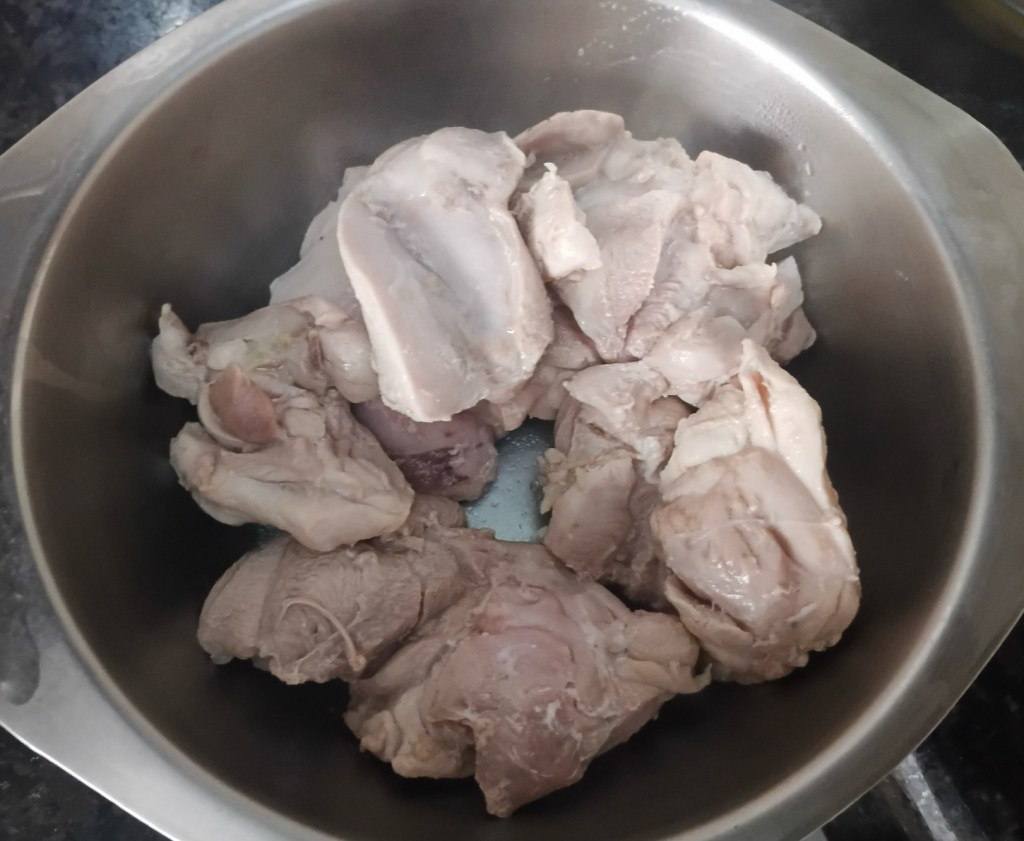 Step 10. Boil the chicken, give it 3 whistles in a pressure cooker. Take out when done.