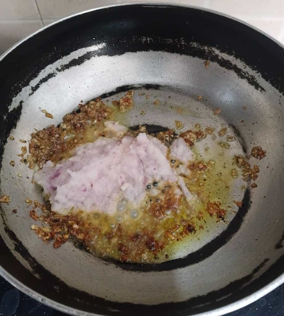 Step 7. Add the beated ginger garlic paste in frying pan and heat well. Keep mixing.