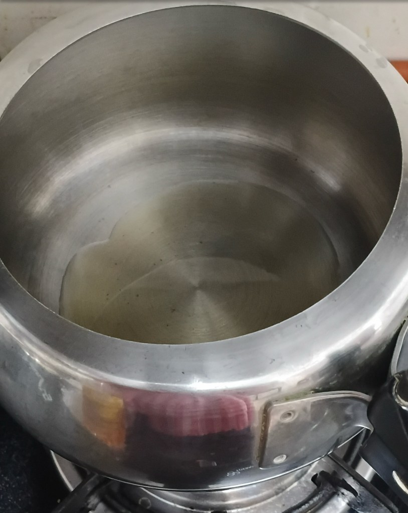 Step 9. Now, take 4 spoon cooking oil. Add it in a pressure cooker.