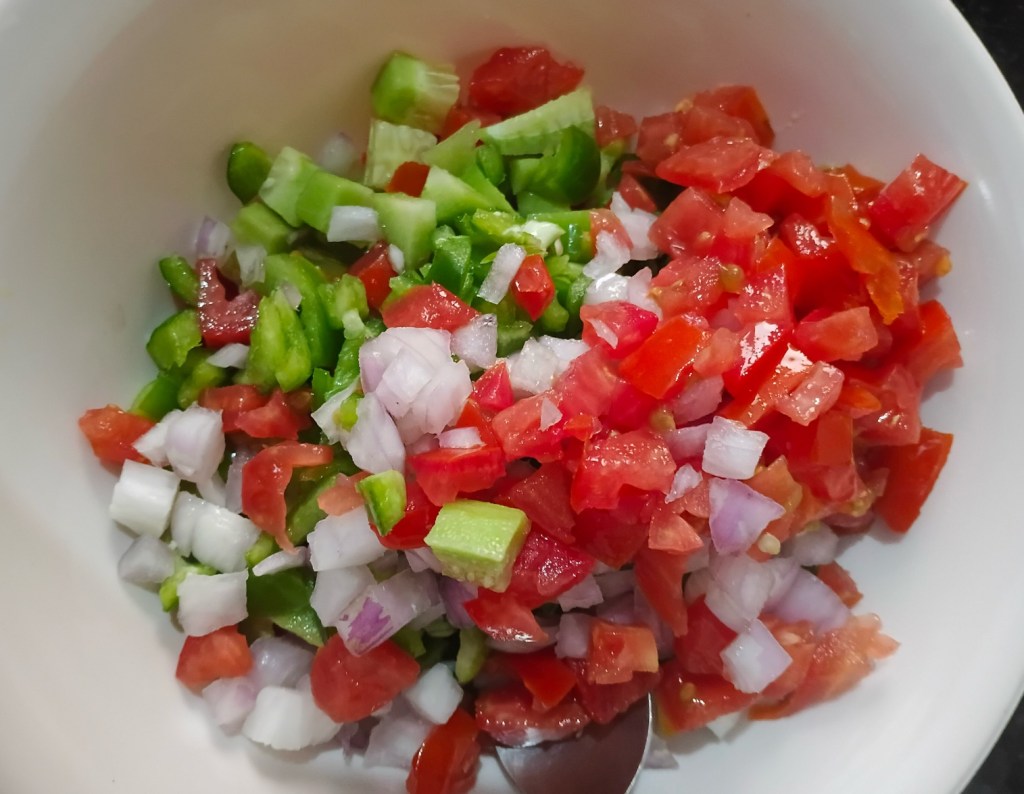 Step 1. Finely cut vegetables for salad, one capsicum, one onion and one tomato.