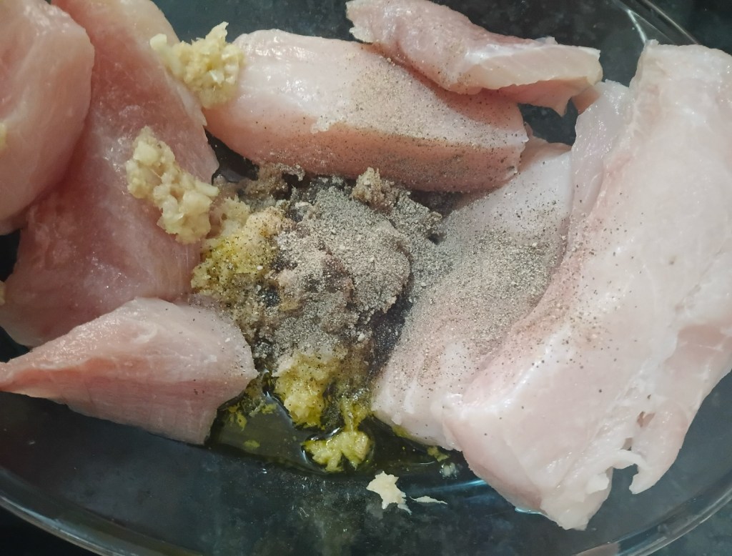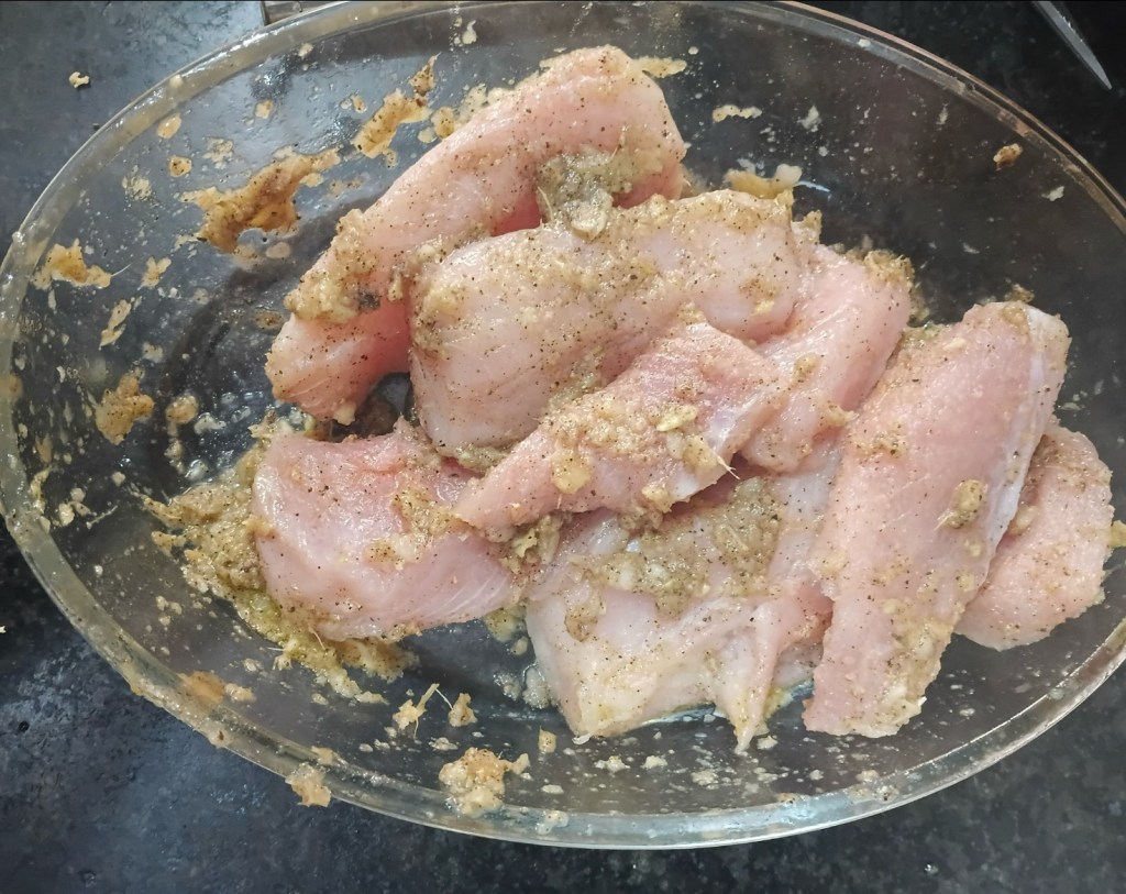 Step 6. Add the ginger garlic onion paste in a bowl. Add washed fish in it and add black pepper and salt to taste. I added 1 tablespoon of black pepper and one teaspoon of common salt. Add one tablespoon of preheated mustard oil. Don’t use raw mustard oil it adds distinct smell. You can use other oil if you can’t preheat mustard oil.