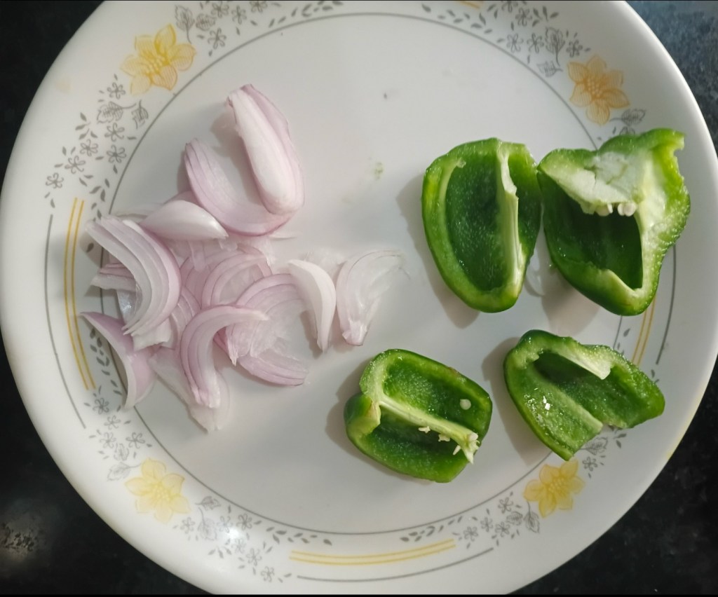 Step 3. Cut onions long and cut capsicum into 4 parts removing edges.