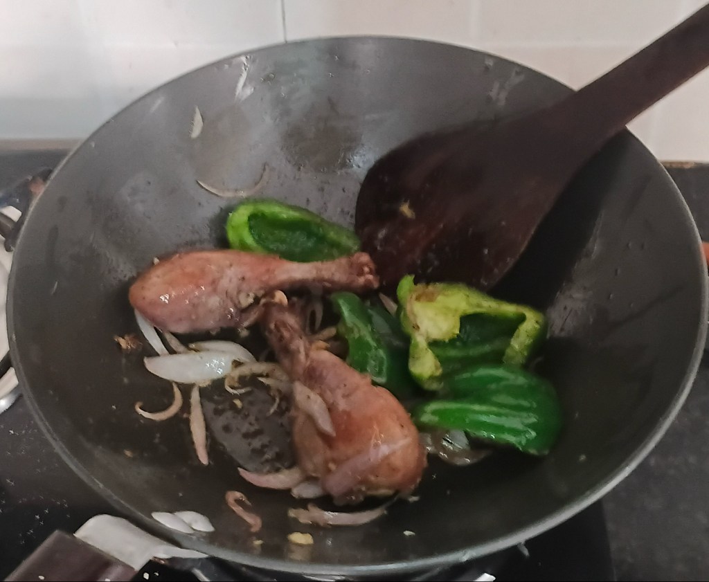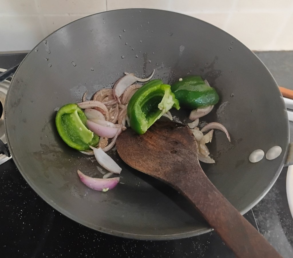 Step 6. Add cut capsicum into frying pan now. Toss it.