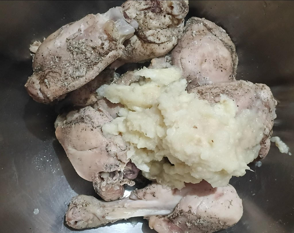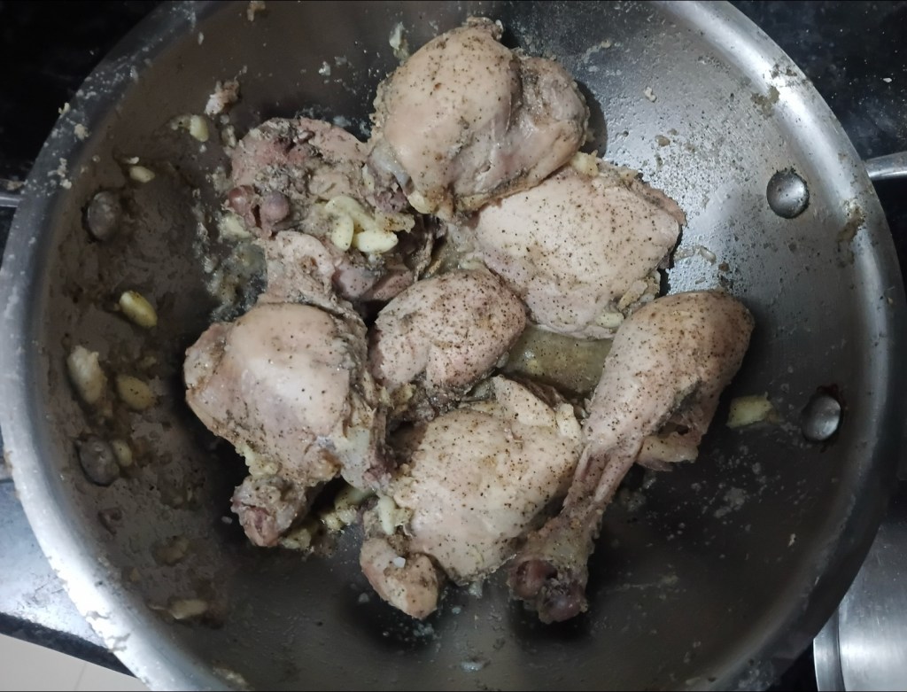 Step 6. When chicken is cooler add ginger garlic paste made in steps above to chicken. Sprinkle black pepper and common salt on chicken.