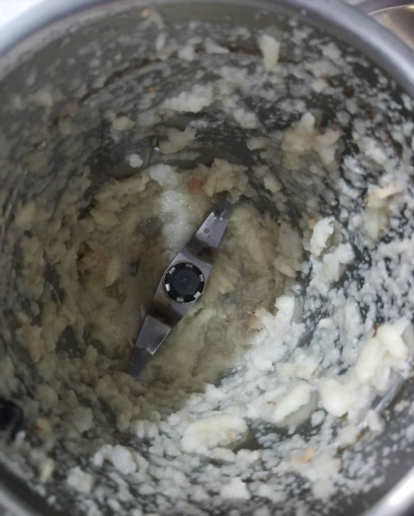 Step 4. Here is the paste in grinder, after adding few drops of water by making the garlic wet.