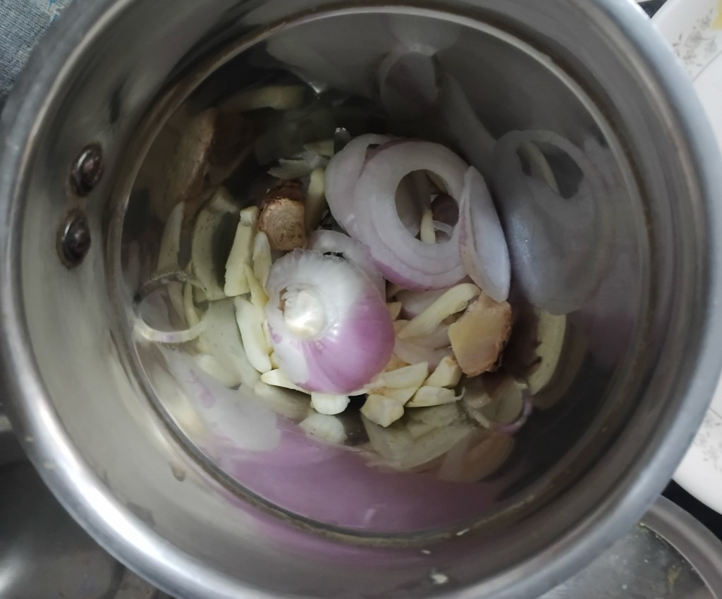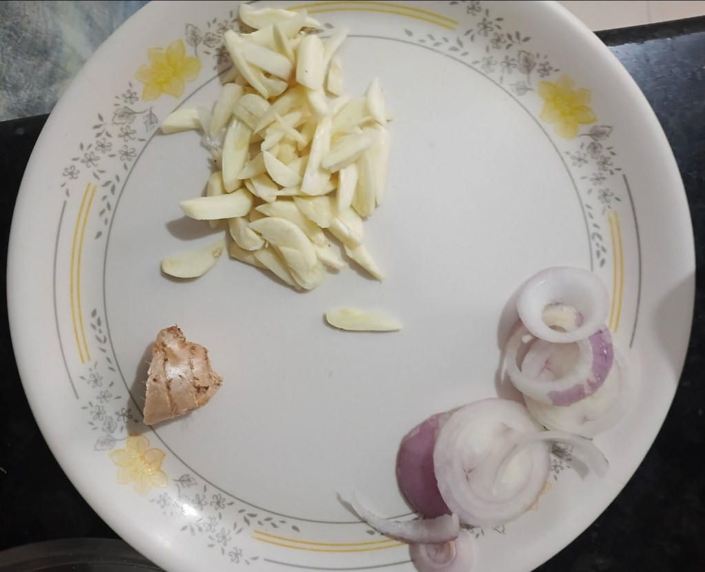 Step 2. Take one garlic, one inch ginger and some onion for marination.