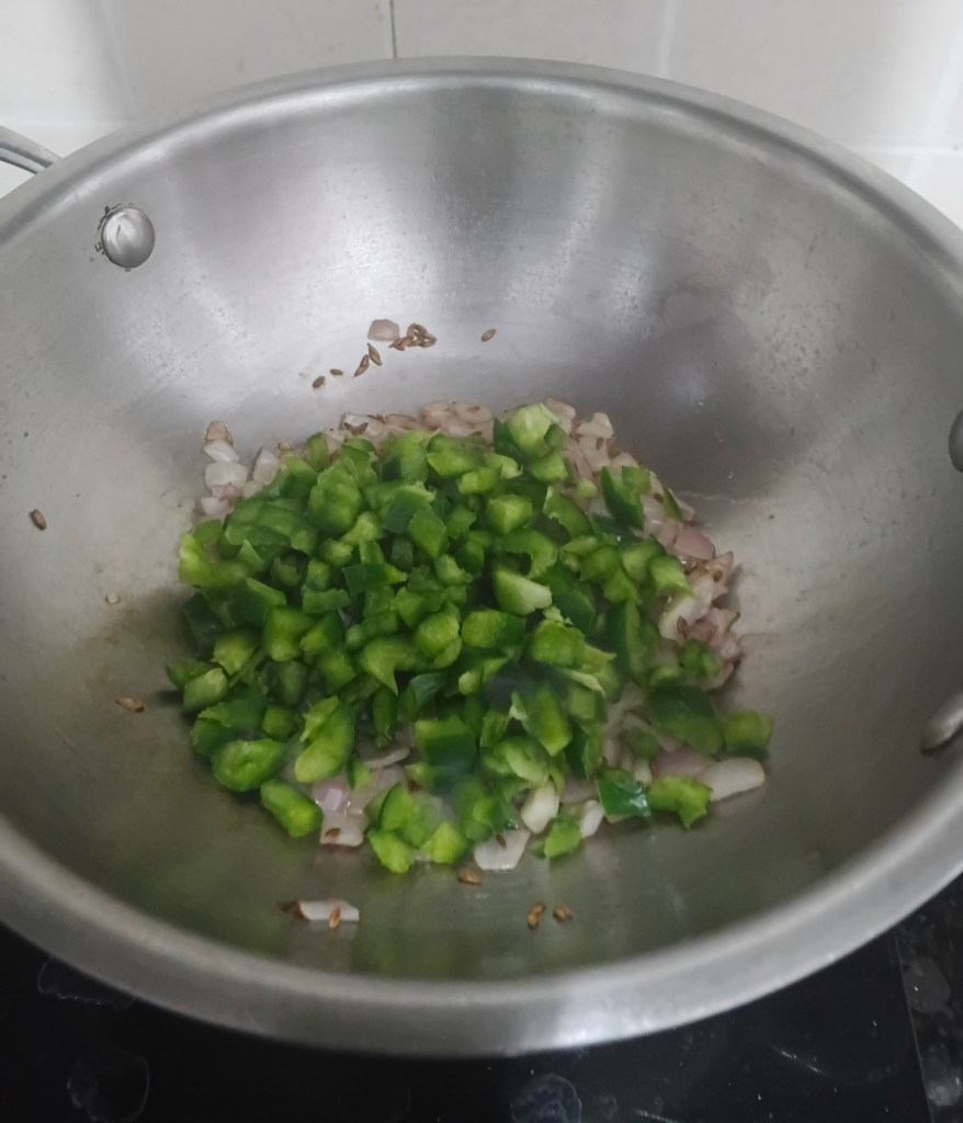 Step 5. Now add capsicum to the frying pan. Heat well till capsicum are soft and turns dull green in shade.