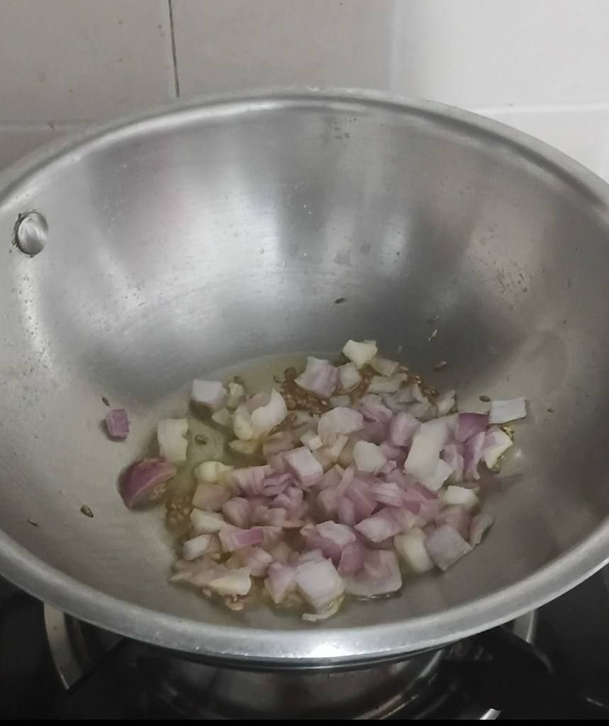 Step 4. Heat one tablespoon of vegetable oil in frying pan, add cumin to it once oil is hot. Immediately add cut onion. Mix well.