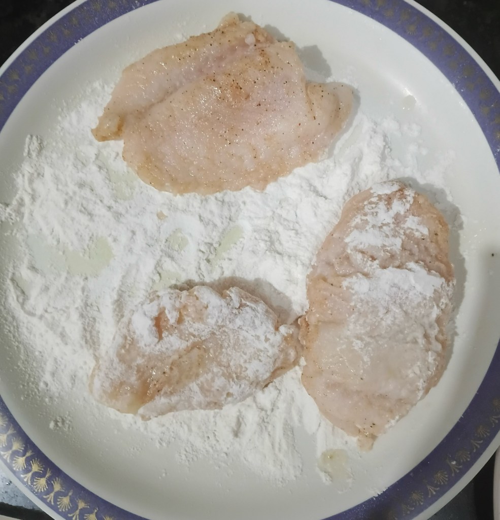 Step 7. Take it off the pan in 5 minutes heating time. Cover the hot wet fish with refined flour on both sides. Time for another deep fry in new oil.