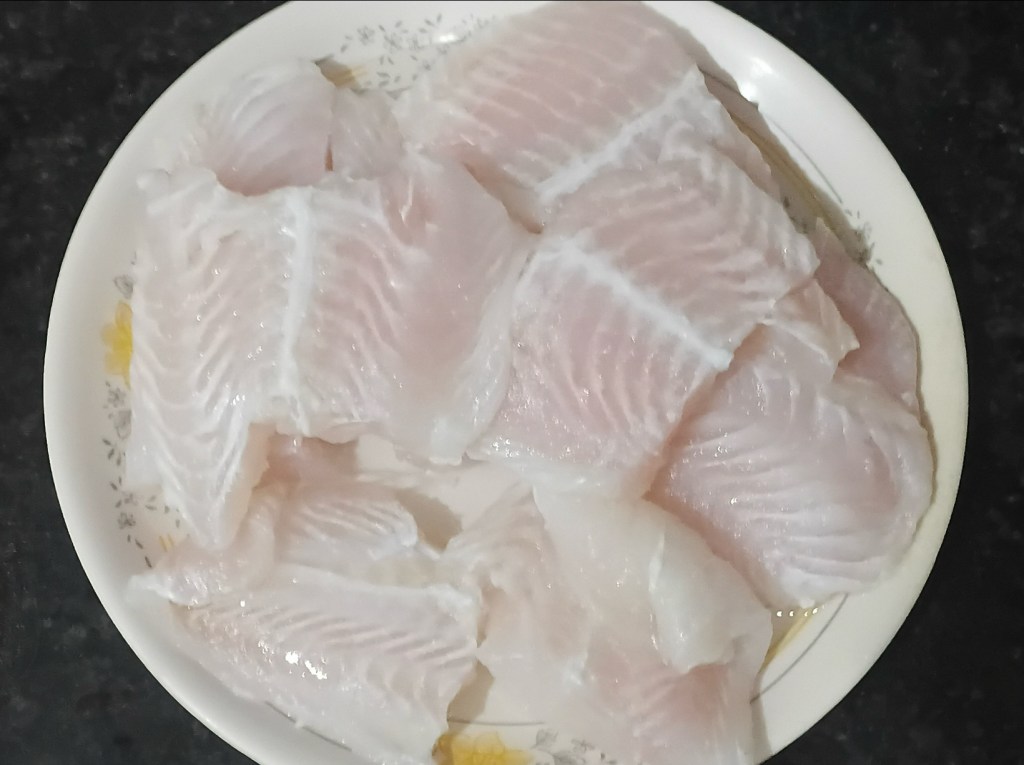 Step 1. Keep basa fish in water with salt for half hour. Then the fish would be mildly soft, cut 4 parts each.