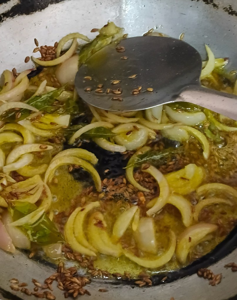Step 6. Heat vegetable oil in frying pan. Once heated add cumin seeds and curry leaves in it.