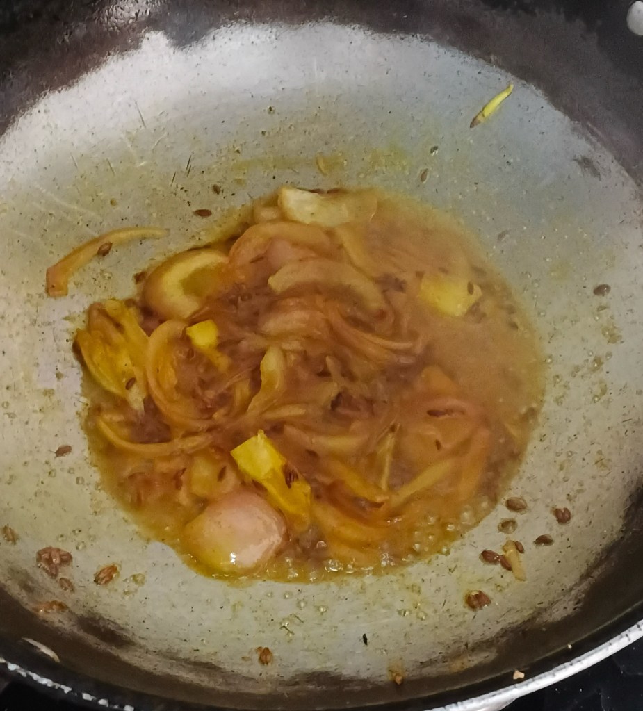 Step 12. in the meantime fry another onion in frying pan, add turmeric for color and cumin seeds, once onions are fried add one third cup of water. Add it on top of pan.