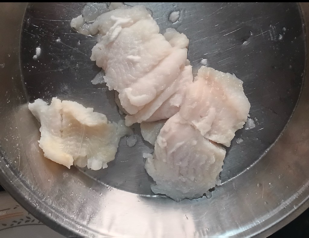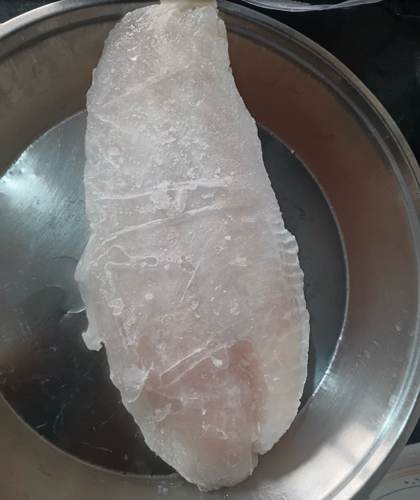 Step 1. Take frozen fish out of freezer. I took Basa fish, half Kg with ice. Wash it once.