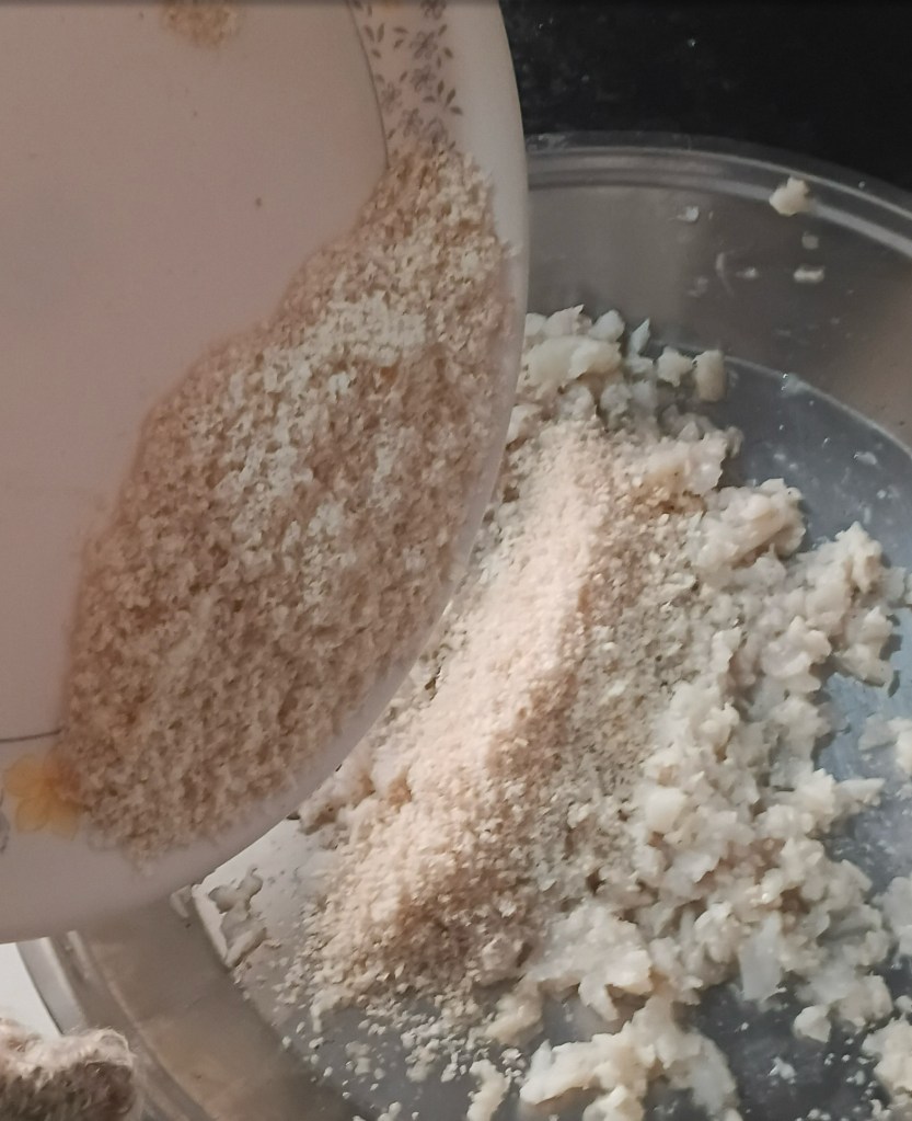 Step 8,. Now add breadcrumbs to the mashed fish. Add one teaspoon salt and one teaspoon black pepper into it. Knead so that every constituent consistency is uniform.