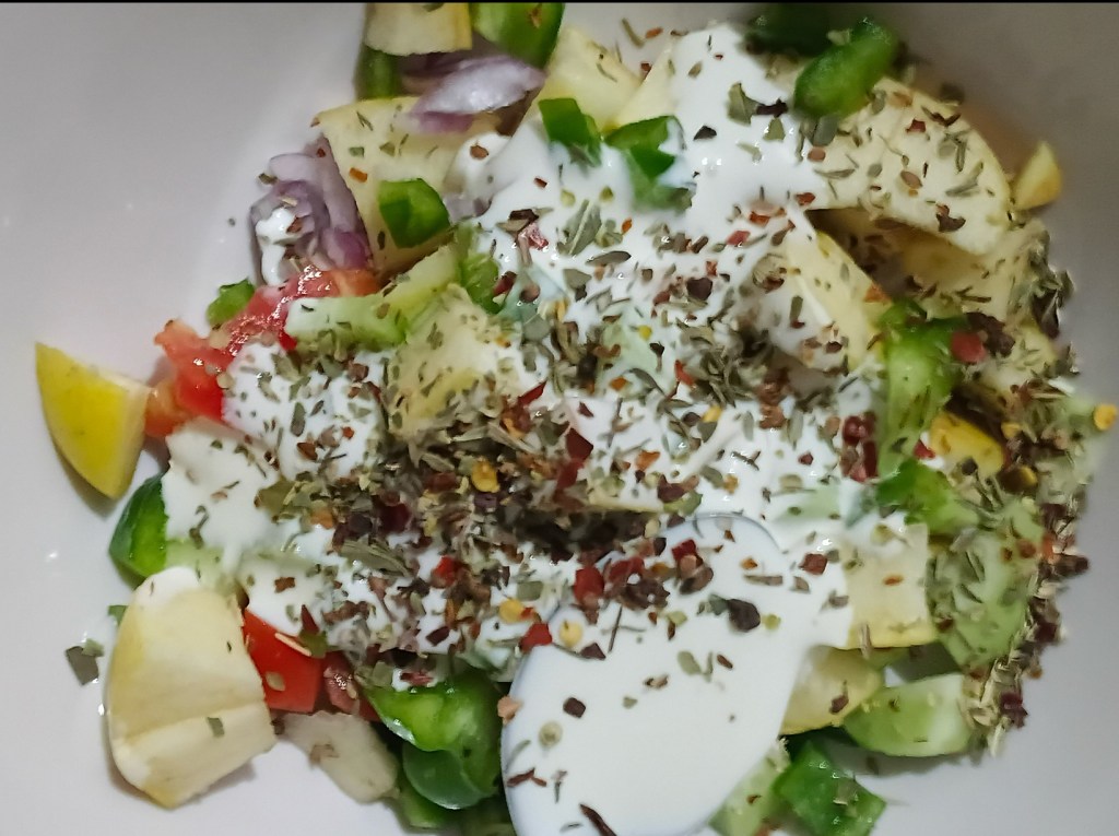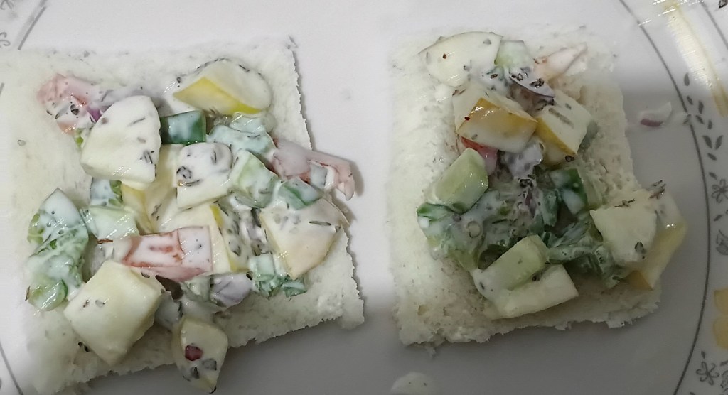 Ingredients: Apple, capsicum, tomato, cucumber, onion, cheese spread, Italian seasoning, salt, bread. That’s it guys!