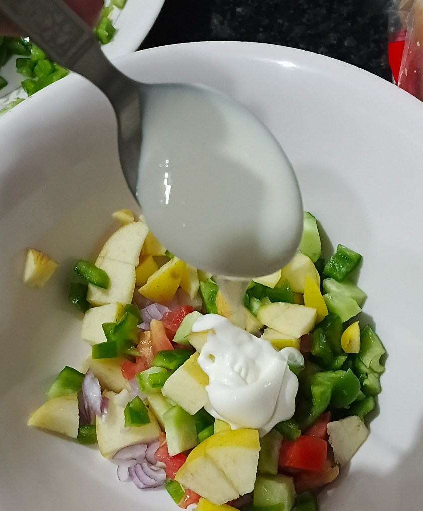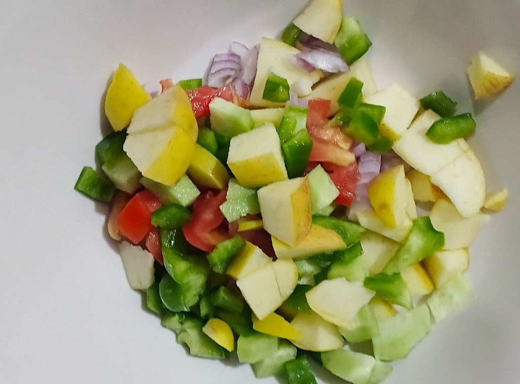 Step 1. Cut the vegetables and apple into small pieces. Take following vegetables: capsicum, tomato, cucumber, and onions. Take one serving spoon of each kind of ingredients for meal for two.