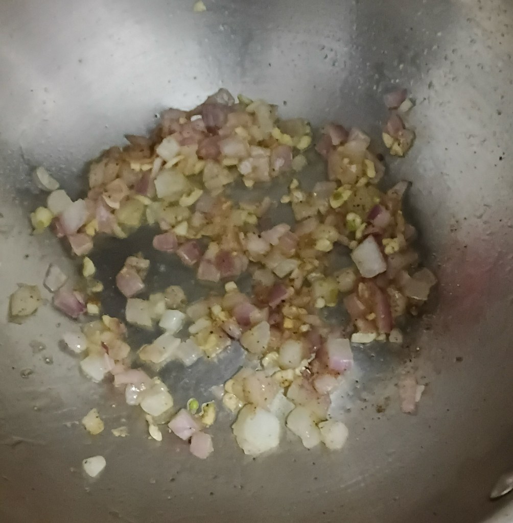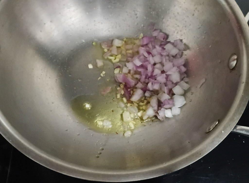 Step 8. Now add onion and garlic in frying pan.
