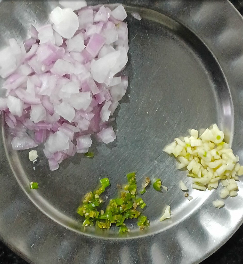 Step 6. Chop one small onion, 3 cloves of garlic and one green chilli.