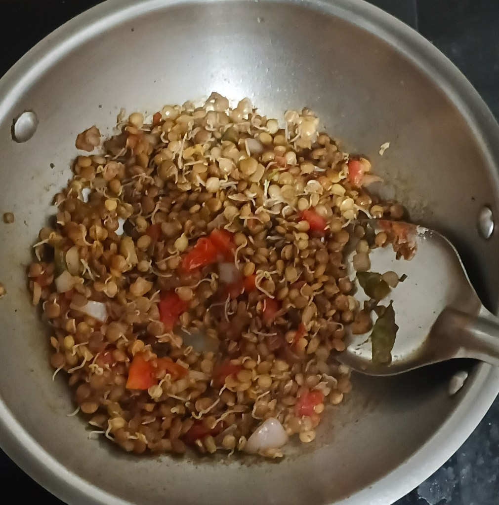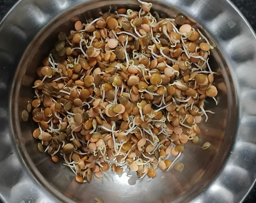 Step 3. Grow sprouts two days before. Take half bowl of brown lentils and soak it in clear water overnight, in day take water off and keep it outside. Let it sprout. Second day evening you would be ready with roots. Wash it with clean water.