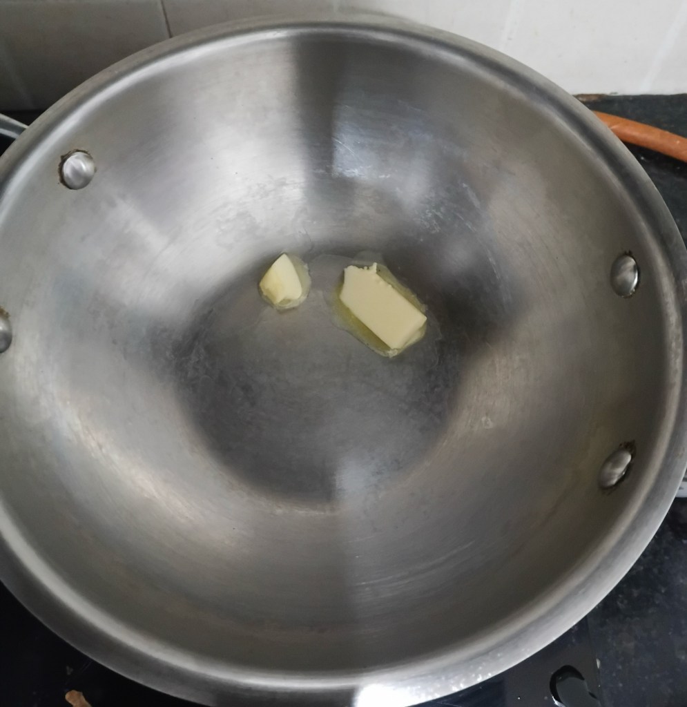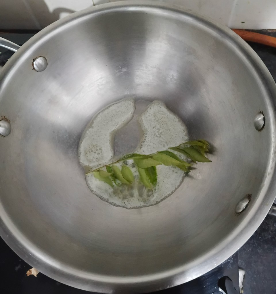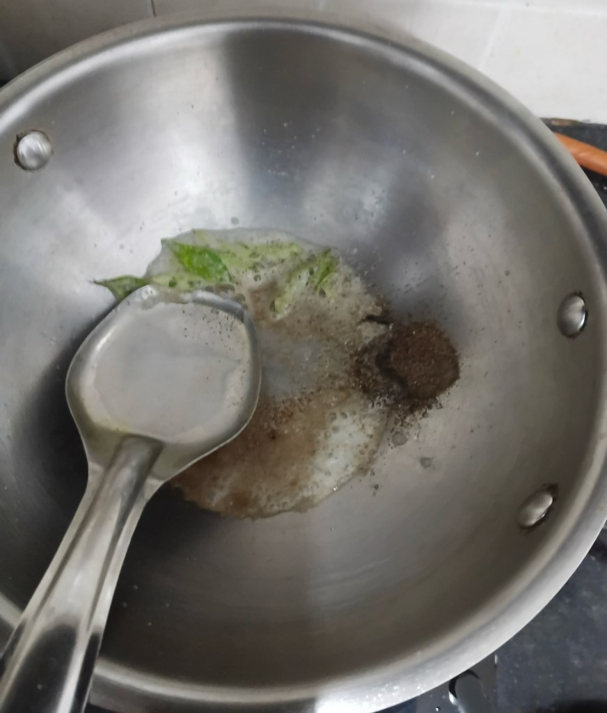 Step 6. Add black pepper when butter melts and curry leaves are immersed in melted butter. Let black pepper simmer.