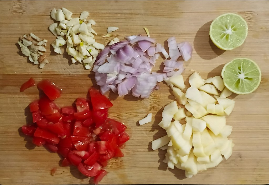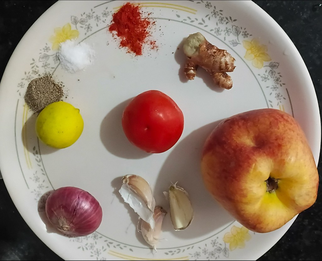 Step 1. Take 3 cloves of garlic, some ginger just for flavour say, 2 millimeter, tomato, one fourth apple, one small onion, 1 small lemon, black pepper, salt, Spanish paprika.