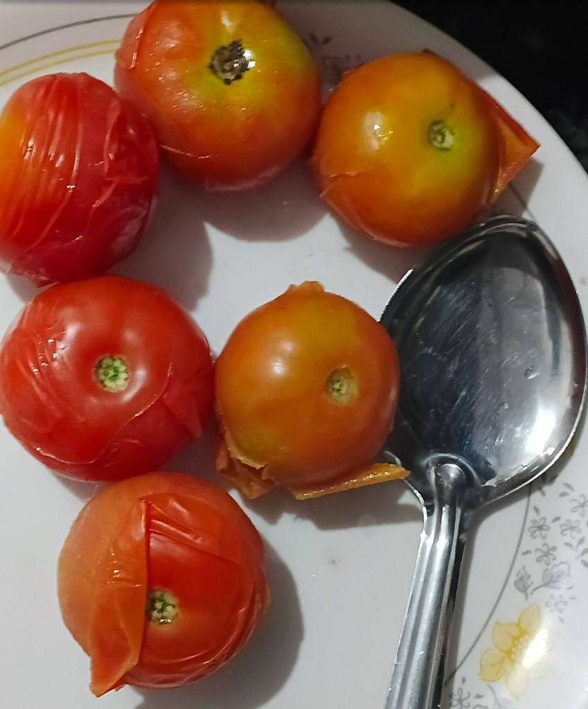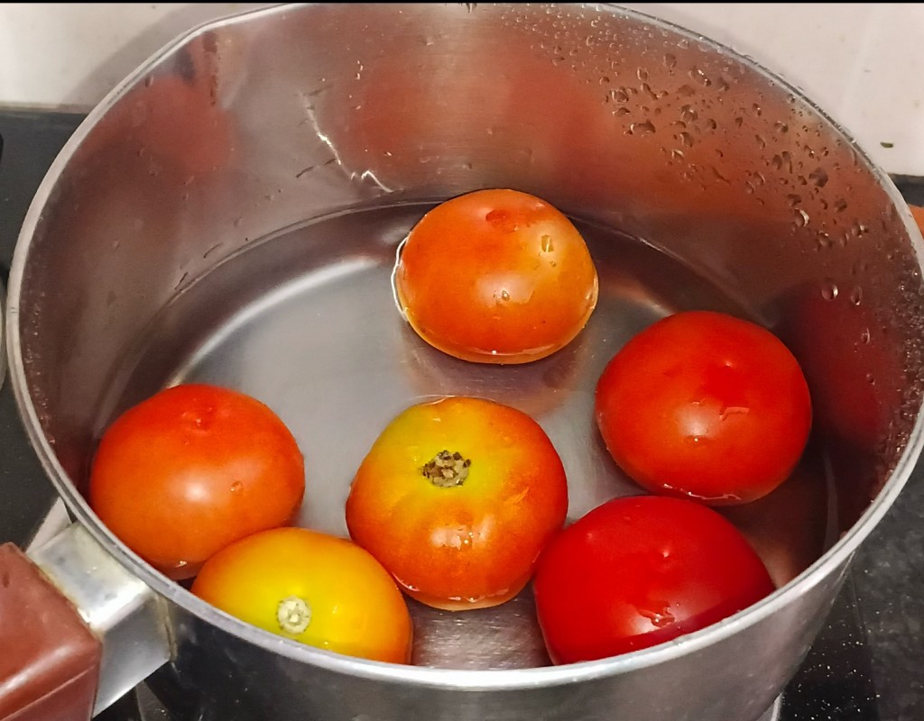 Step 1. Take 6 medium sized tomatoes. Wash them and heat them for 3 minutes in a pan with water. Water as much as to dip tomatoes at level. We ll use this water later.