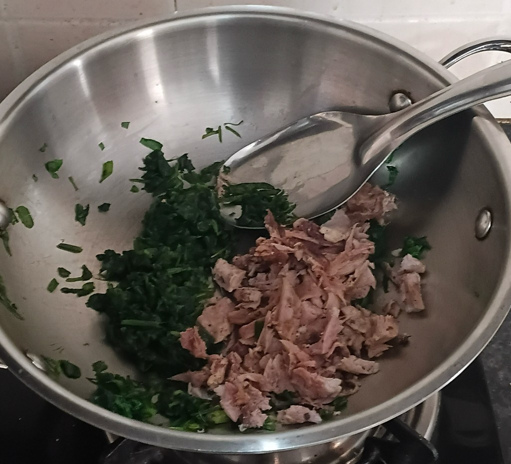 Step 3. Add spinach in frying pan and mix it well. Heat it on low flame.