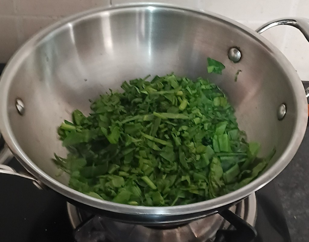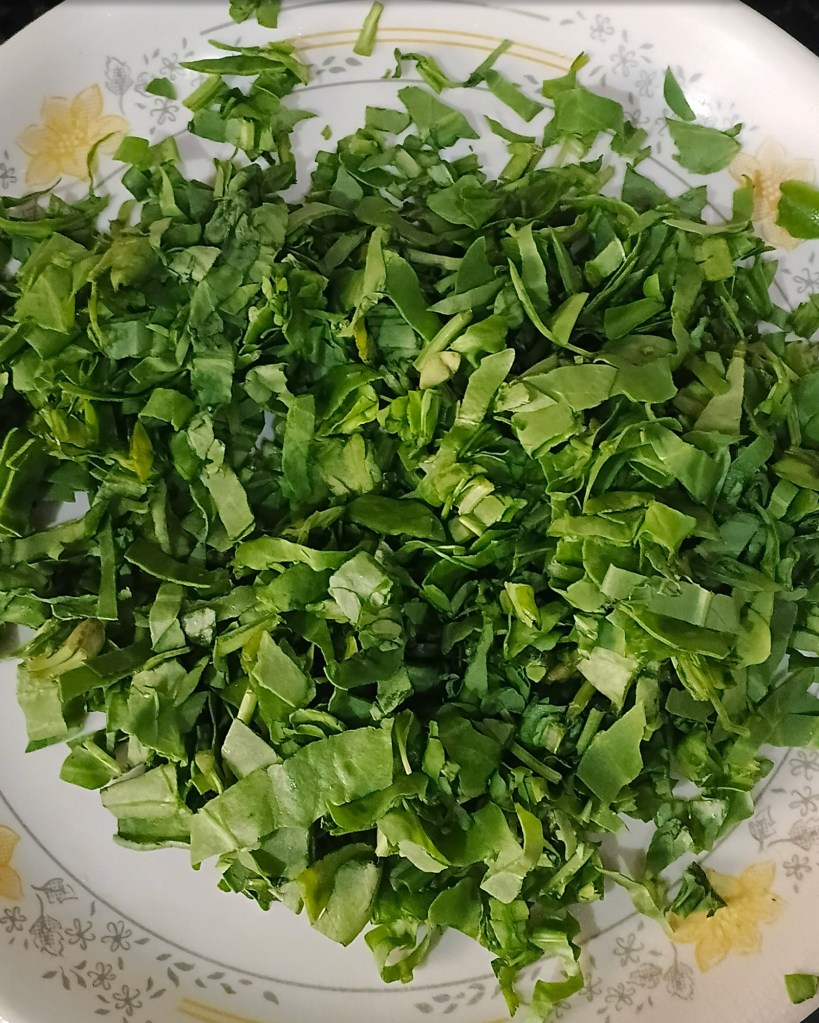 Step 1. Wash spinach in water thoroughly. Dry it in a soaking paper or newspaper. Cut it in small parts as below.