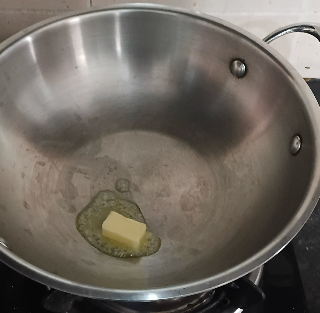 Step 8. Now add cheese in frying pan, 2 tablespoons to frying pan, heat it till it melts.