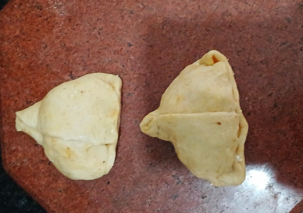 Step 8. Fill in the triangle bread we made above with cottage cheese mixture we made here.
