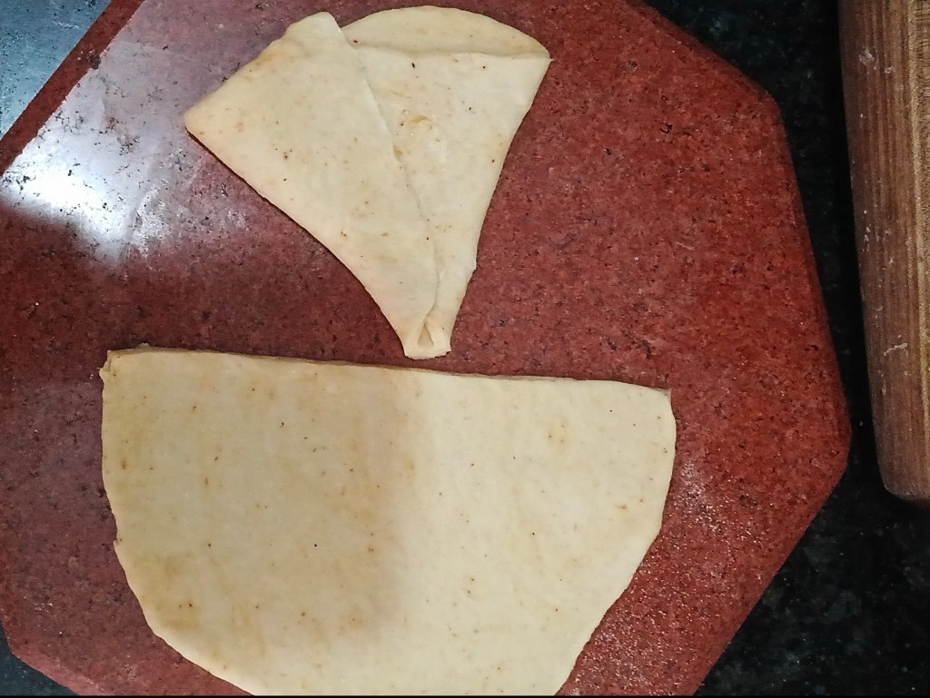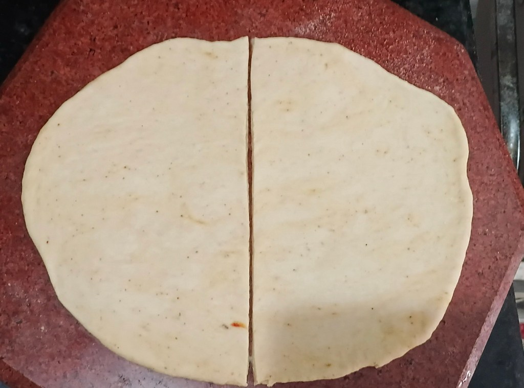 Step 4. Take one part and roll a circle on a roller. Cut it in half.