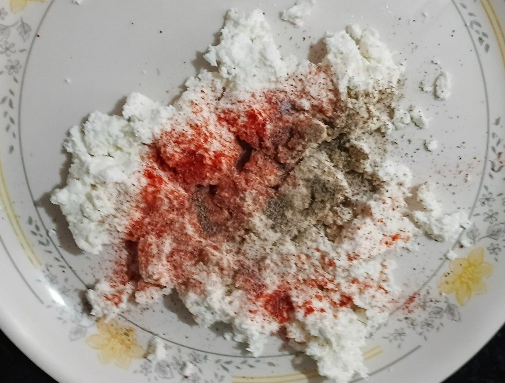 Step 7. Add Spanish paprika, black pepper and salt. Knead cottage cheese in a mixture form.