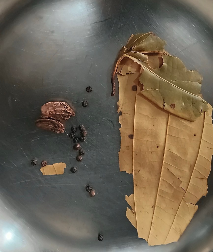 Step 3. Take one bay leaf, some black pepper and big cardamom.